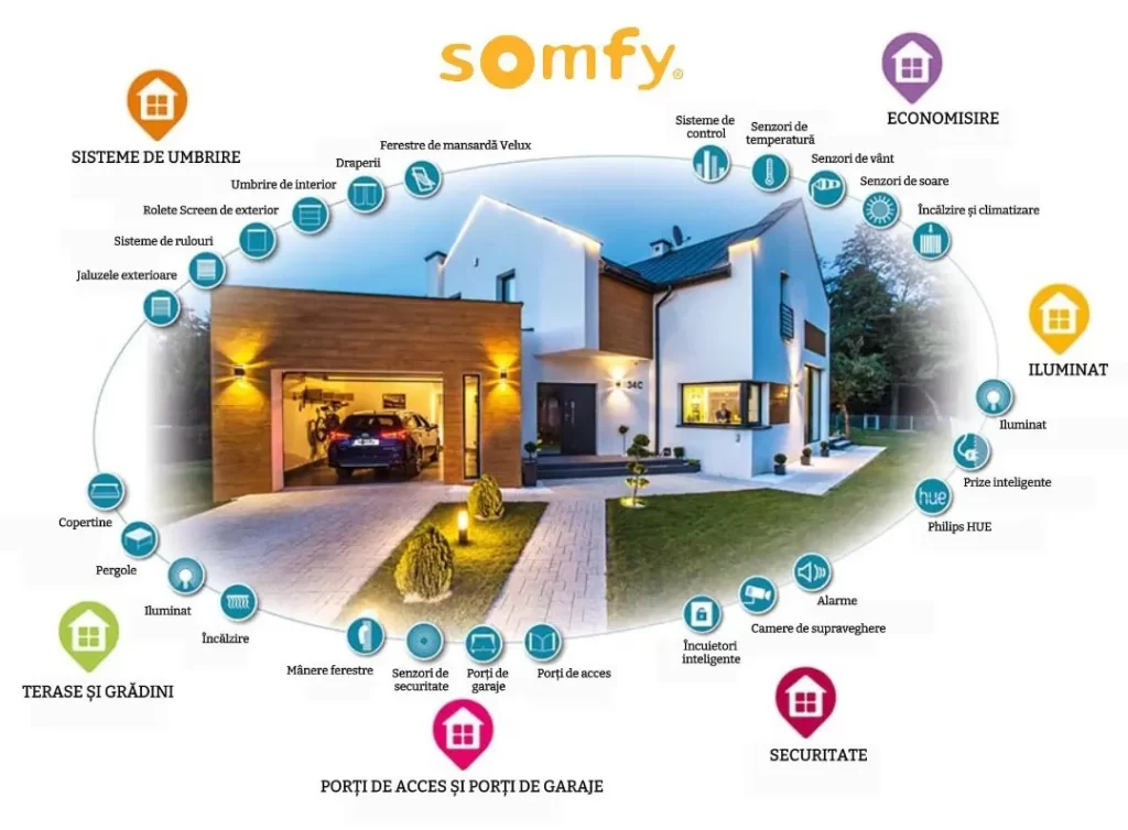Somfy oferă soluții avansate pentru automatizarea sistemelor de umbrire, integrate în ecosistemele Smart Home. Prin intermediul unității de control TaHoma Switch, utilizatorii pot gestiona jaluzelele, rulourile sau roletele prin aplicații mobile, telecomenzi sau comenzi vocale. Aceste sisteme pot fi programate să reacționeze la condițiile meteo, optimizând astfel confortul și eficiența energetică a locuinței.
